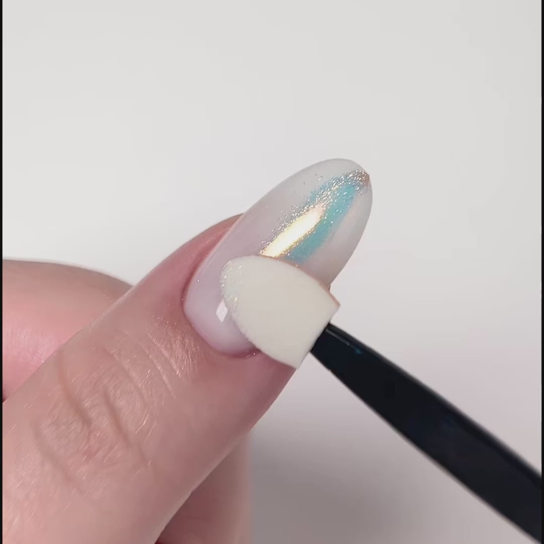 - Rub in pigment: Using a sponge or applicator, pick up a rice-grain amount of Harmony powder and rub with light pressure until the multichrome mirror pops.